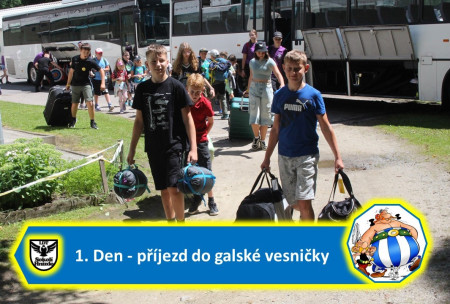 Šťastně jsme dnes dorazili do galské vesničky. Ubytování ve vesnických chalupách a domečcích proběhlo velmi rychle, neboť jsme se těšili na první galskou pochoutku. Rizoto z krůtího masa a okurkou bylo právě tím správným jídlem. Po obědě se všechny galské oddíly vydaly na seznamování s okolím, se sousedy a kamarády. Proběhly seznamovací hry a po večeři se nám představil každý člen personálu. Byla slavnostně vztyčena táborová vlajka. Večer bylo seznamování zaměřeno na taneční parket a úvodní diskotéku nám zahrál DJ Maty. První den byl u konce a my jsme se uložili na vesnická lůžka.