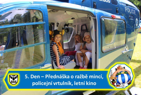 Ráno jako malované, příjemný svěží vzduch, ranní rozcvička, velmi chutná snídaně a den před námi. Dnes nás čekala přednáška pana Dana Richtra, ve které nám řekl, jaké bylo umění starých mistrů při ražbě mincí. Velmi poutavé vyprávění bylo doplněno ukázkou výroby ražení mincí a tyto mince jsme prostudovali podrobně. Během dne na nás čekalo velké překvapení. Do galské vesničky přiletěl policejní vrtulník. Do vrtulníku jsme mohli nasednout a zjistit jaké pohodlné cestování tímto strojem může být. Do galské vesničky nás také přijel pozdravit ředitel Krajského ředitelství policie Středočeského kraje brig. gen. JUDr. Václav Kučera, PhD., MBA, který všem galským osadníkům, mimo jiné, popřál krásný pobyt v táboře plný zážitků. Večer následovalo letní kino s promítáním filmu ve stylu celotáborové hry.