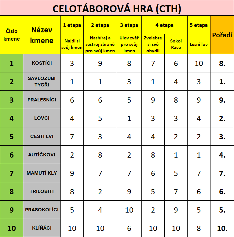 Týmy, jejich umístění v jednotlivých etapách a finální pořadí